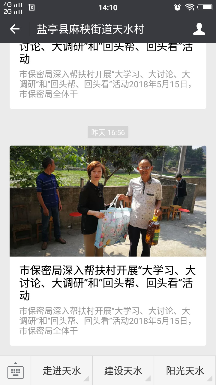 全村幅員面積3.4平方公里,耕地943畝、林地2950畝。轄9個(gè)村民小組,2017年底,共有426戶1057人。2014年被確定為省定貧困村,全村建檔立卡貧困戶63戶151人,貧困發(fā)生率達(dá)14.3%。2014年至今,在綿陽(yáng)市環(huán)境保護(hù)局、綿陽(yáng)市保密局、鹽亭縣環(huán)境保護(hù)局等部門(mén)的對(duì)口幫扶下,天水村聚焦“算得攏的收入、看得到的變化、靠得住的保障、掙得到的能力、信得過(guò)的認(rèn)可”分戶施策,精準(zhǔn)發(fā)力,充分運(yùn)用好各項(xiàng)扶持政策,按照“六個(gè)精準(zhǔn)”“五個(gè)一批”的總體要求,圍繞“一水二路三產(chǎn)業(yè)”的脫貧思路,在基礎(chǔ)設(shè)施建設(shè)、產(chǎn)業(yè)發(fā)展、公共配套設(shè)施的提檔升級(jí),在群眾增收上找路子,在產(chǎn)業(yè)發(fā)展中求突破,措施得力,成效明顯,2017年底成功摘帽,實(shí)現(xiàn)整村脫貧。